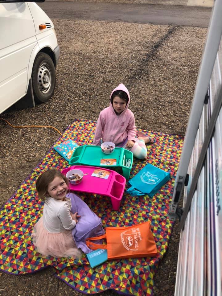 Matilda rose in a delightful mood this morning (lucky Mum knows how to turn that around), so the girls were kicked outside to eat, write on their post cards and draw while we packed up the van.